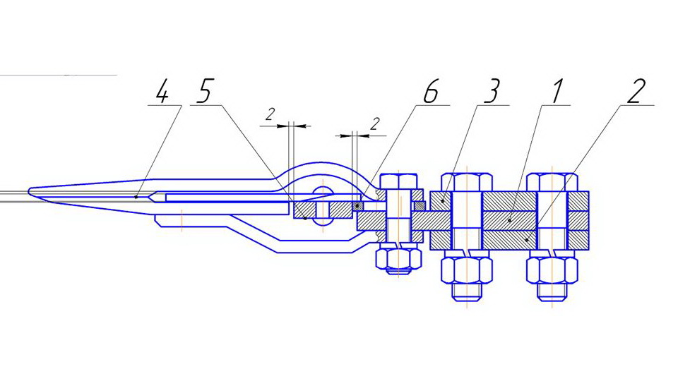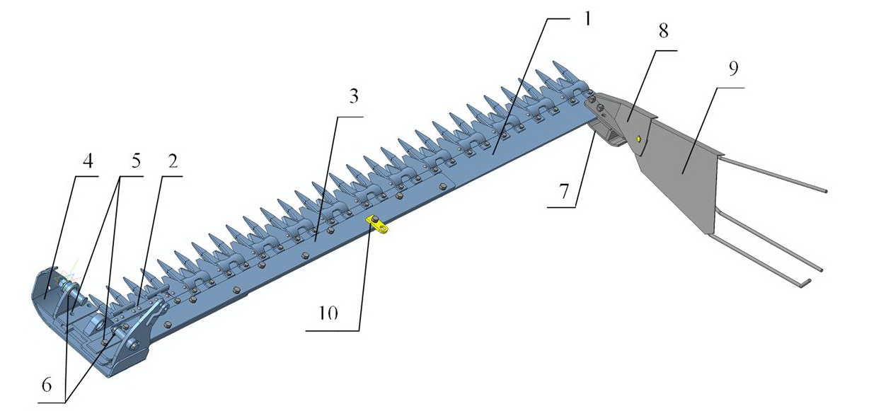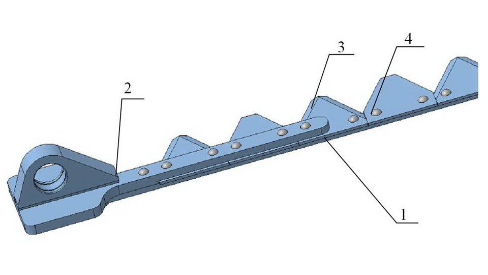 - нож состоит из спинки ножа, головки и сегментов. Спинка ножа изготавливается из полосовой калиброванной стали. К ней приклепываются сегменты и головка. В расточку головки ножа закрепляется шарнирный подшипник. Т.к. пальцы имеют верхнюю и нижнюю режущие кромки, то сегменты приклепываются поочередно вверх-вниз режущей кромкой. Такое изготовление режущего аппарата стабилизирует работу ножа в вертикальной плоскости (рис. 5)