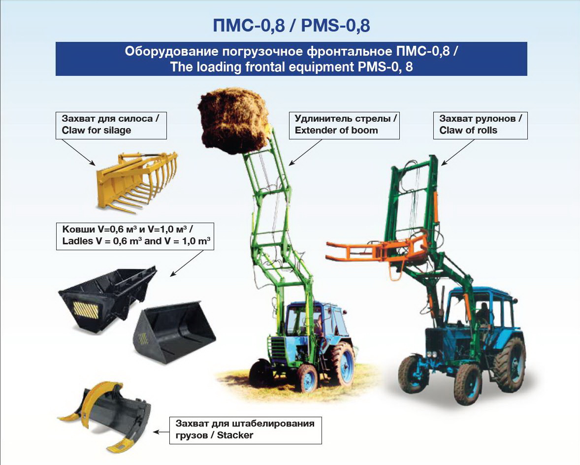 Монтаж: сменные рабочие органы навешиваются на оборудование погрузочное фронтальное ПМС-0,8, а также на другое оборудование с размером по осям стоек 960 мм и диаметром соединительных осей 32 мм.