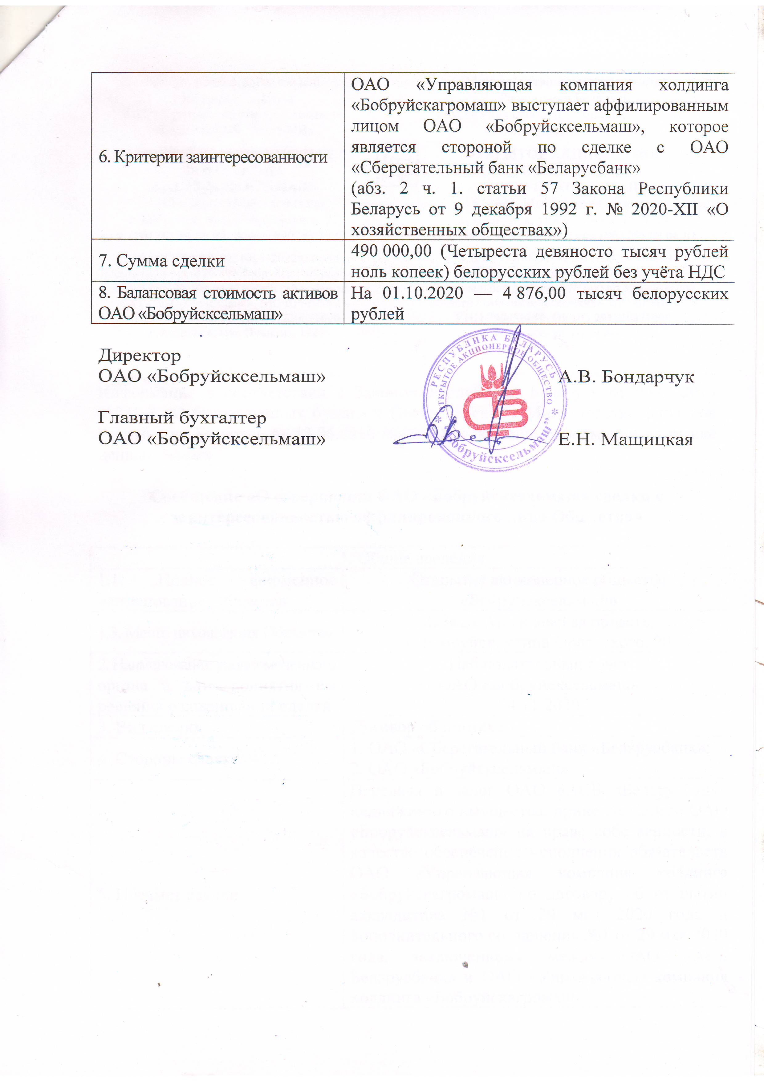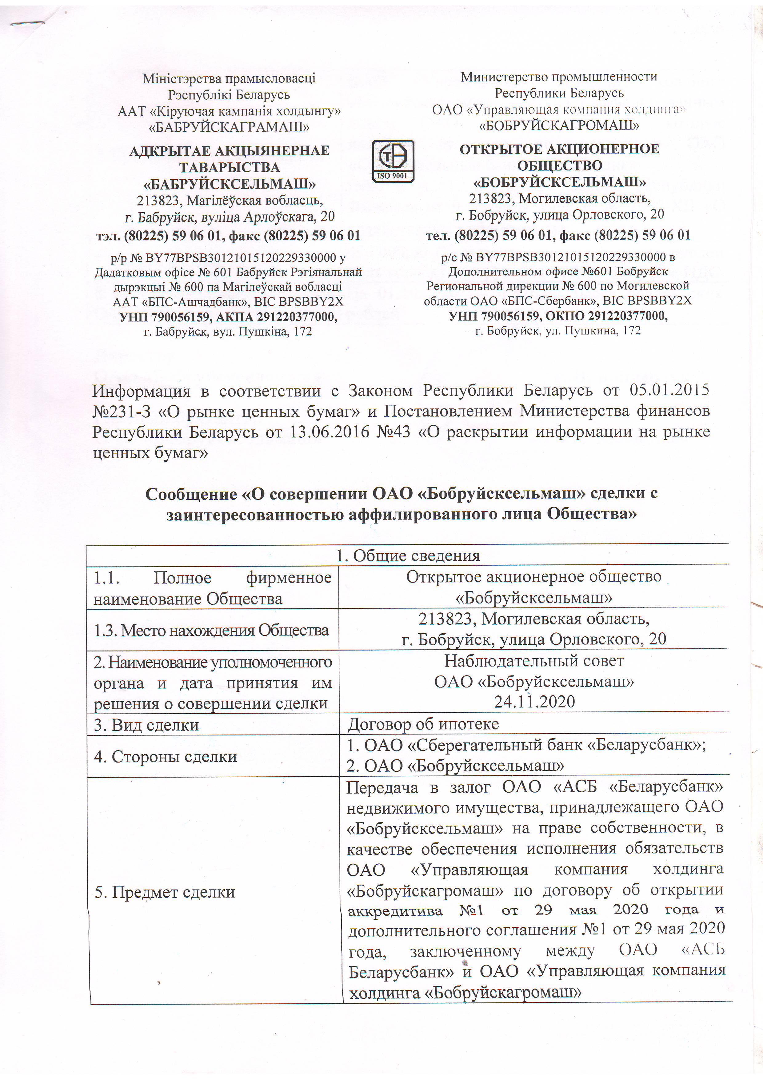 О совершении ОАО "Бобруйсксельмаш" сделки с заинтересованностью аффилированного лица Общества