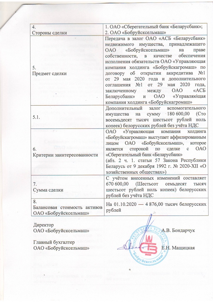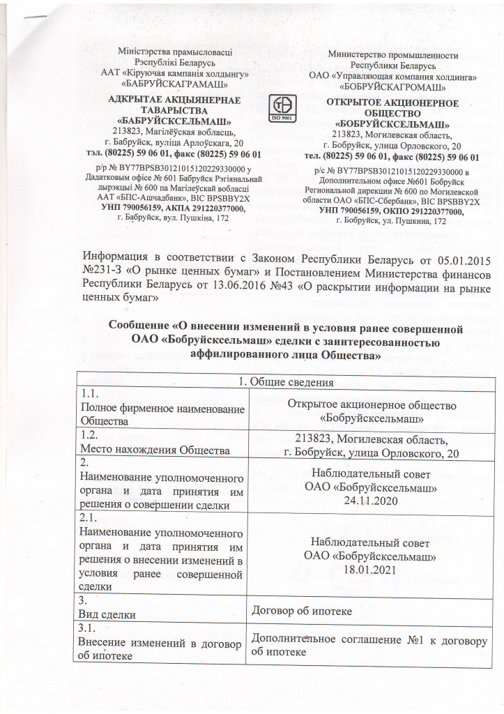 О внесении изменений в условия ранее совершенной ОАО "Бобруйсксельмаш" сделки с заинтересованностью аффилированного лица Общества